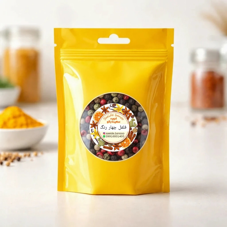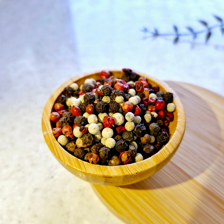 فلفل چهار رنگ ترکیبی از فلفل سیاه، سفید، سبز و صورتی با عطر قوی و طعمی متعادل، مناسب آشپزی حرفهای و خانگی.